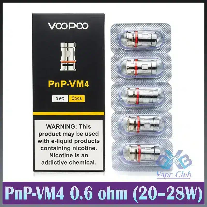 - PnP-VM4 Mesh Coil: DL 0.6ohm mesh coil, 20-28W, recommended regular e-liquid (nicotine ≤ 25mg best)